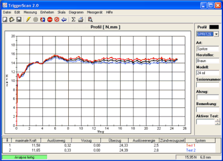 Für den Hersteller von Kanülen kann es von Bedeutung sein, welcher Kraftaufwand erforderlich ist, um die Spritze zu betätigen. Die Anlaufreibung, die Reibung entlang der Wandung, sowie der Widerstand durch die ausströmende Flüssigkeit erfordern bei der Betätigung eine bestimmte Kraft, die mit unserem System ohne weiteres gemessen werden kann. Zudem können die Ursachen für Schwankungen lokalisiert werden. In der nachstehenden Grafik ist z.B. ein deutlicher Anstieg nach ca. 6 mm Wegstrecke zu verzeichnen. |